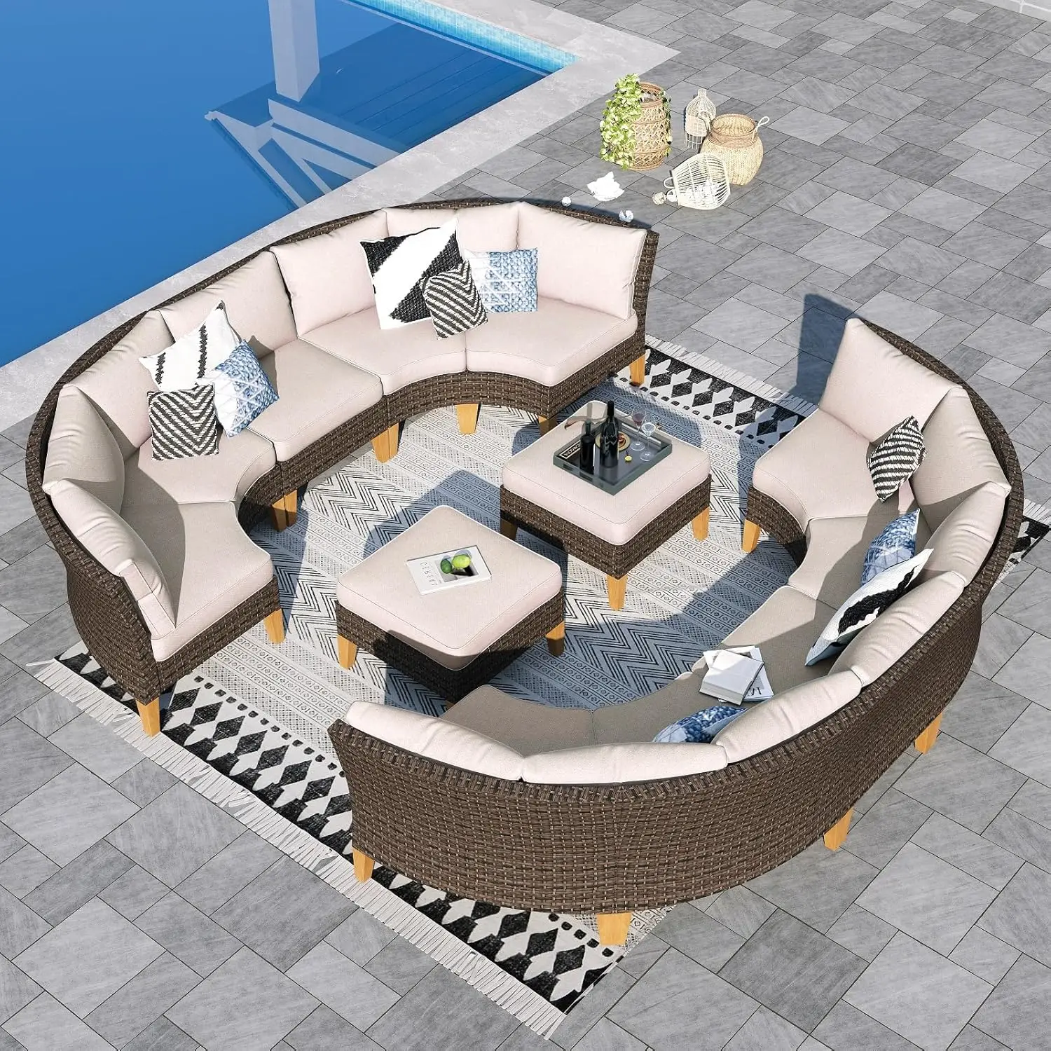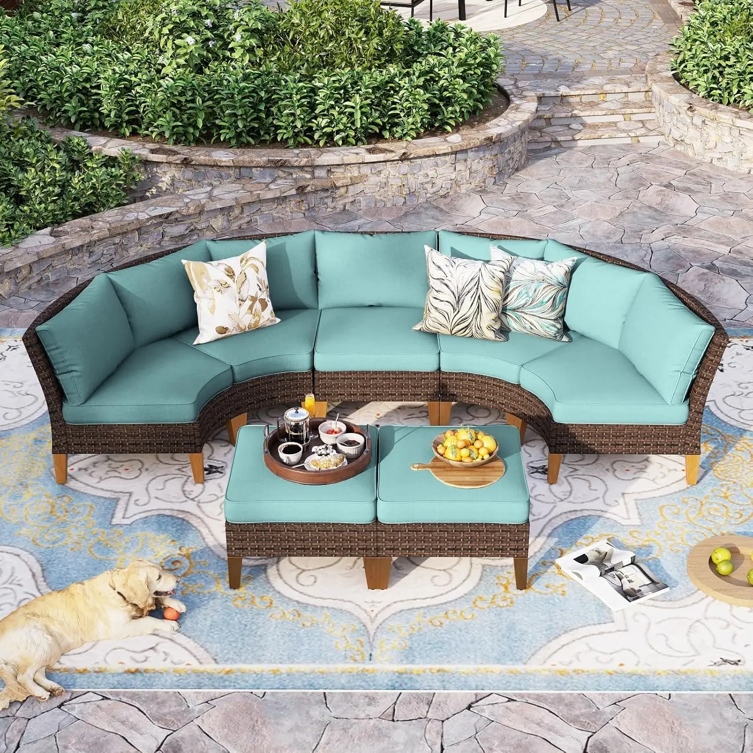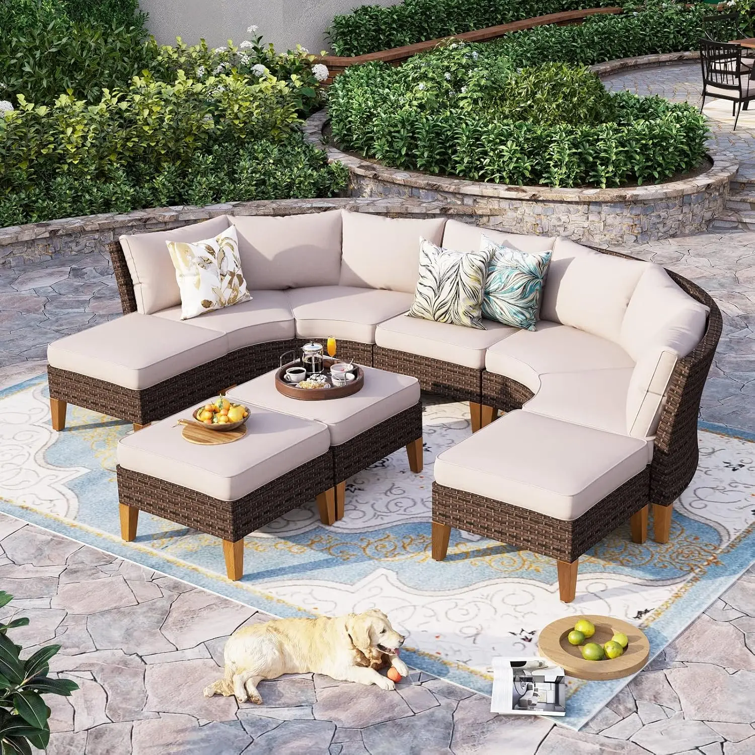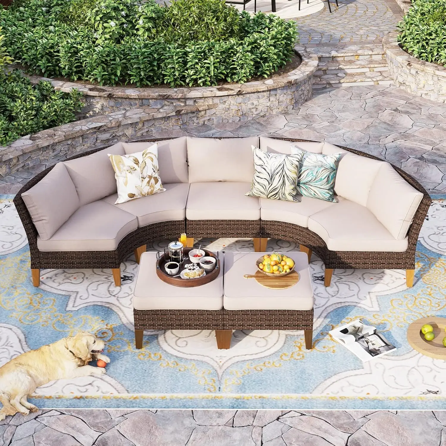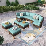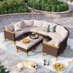 Half Moon Design: Our outdoor patio furniture set features a unique half moon design that adds a touch of elegance and sophistication to your outdoor space. The curved shape creates a cozy and intimate seating area that is perfect for entertaining guests or lounging with your loved ones. This halfmoon set fits in Gazebo. You can also use ottoman in a variety of ways. It can be used as a footrest, extra seating, or even as a coffee table
