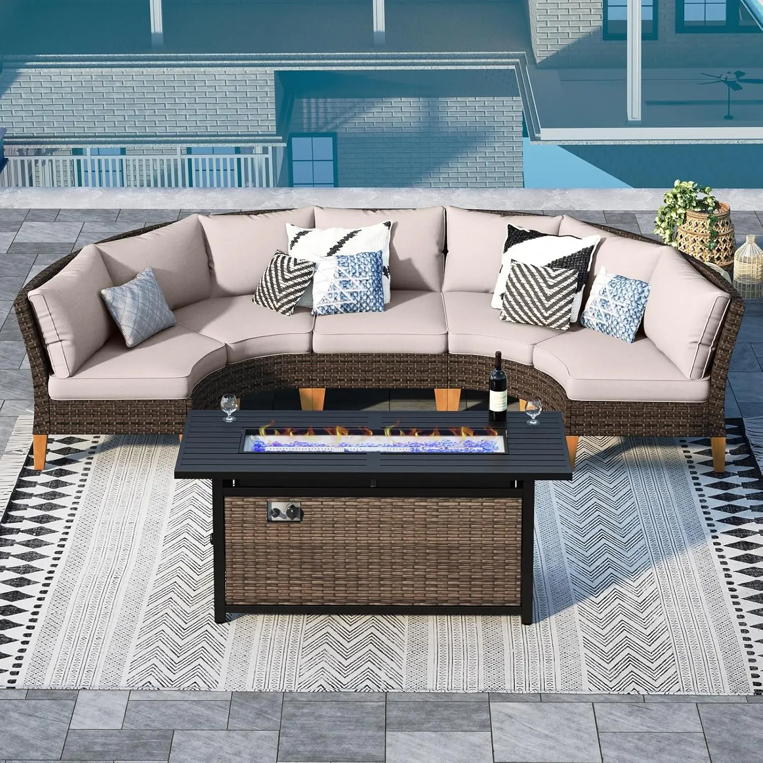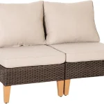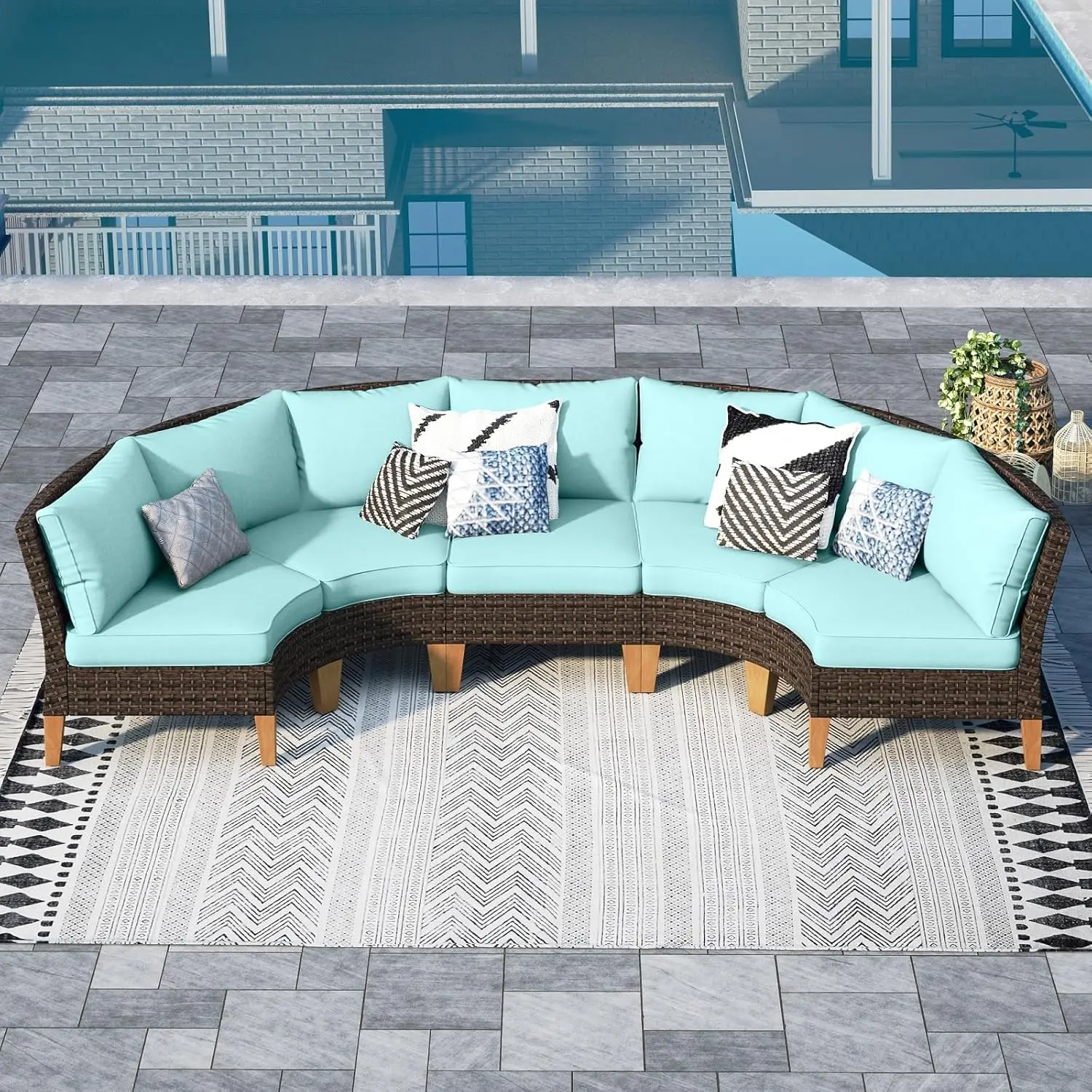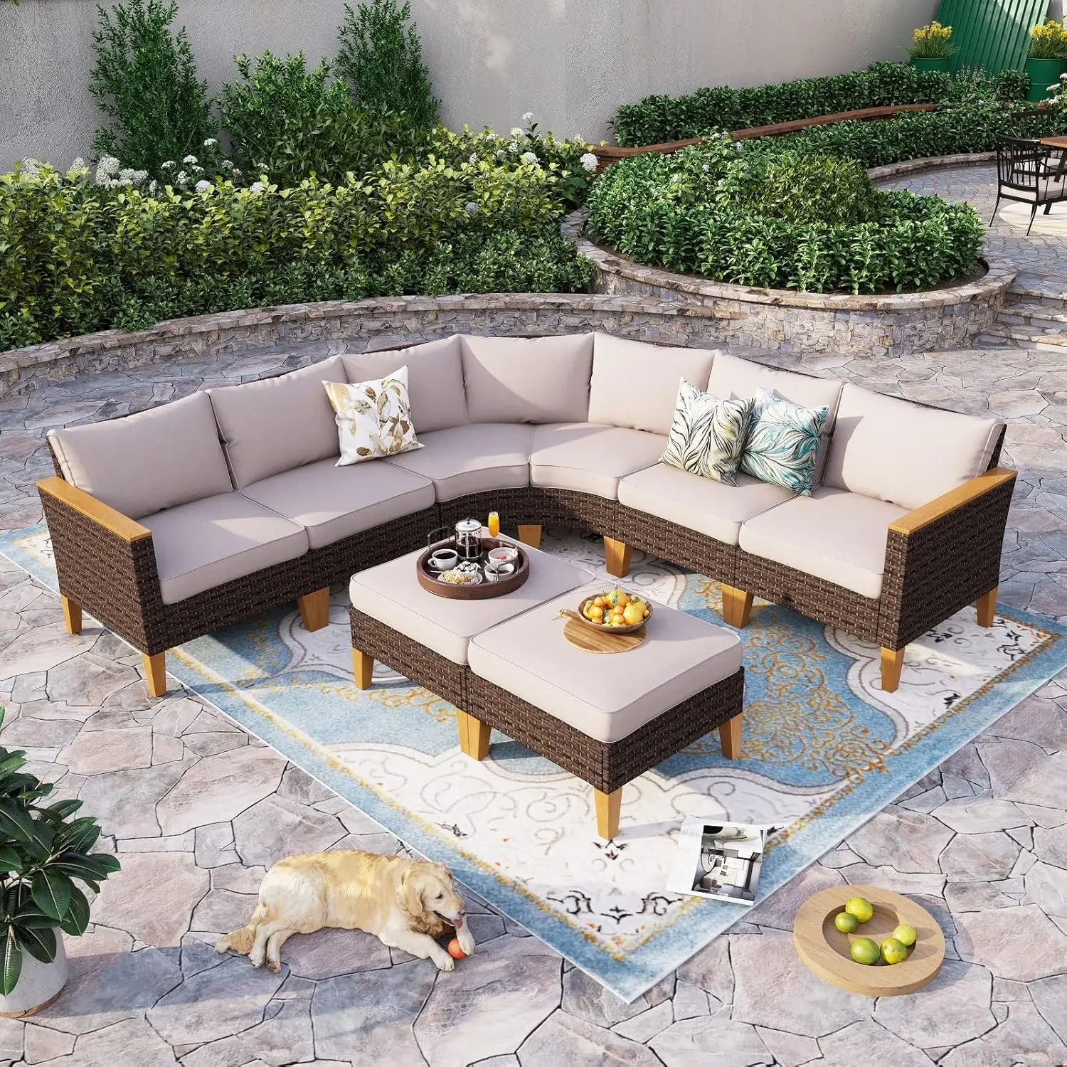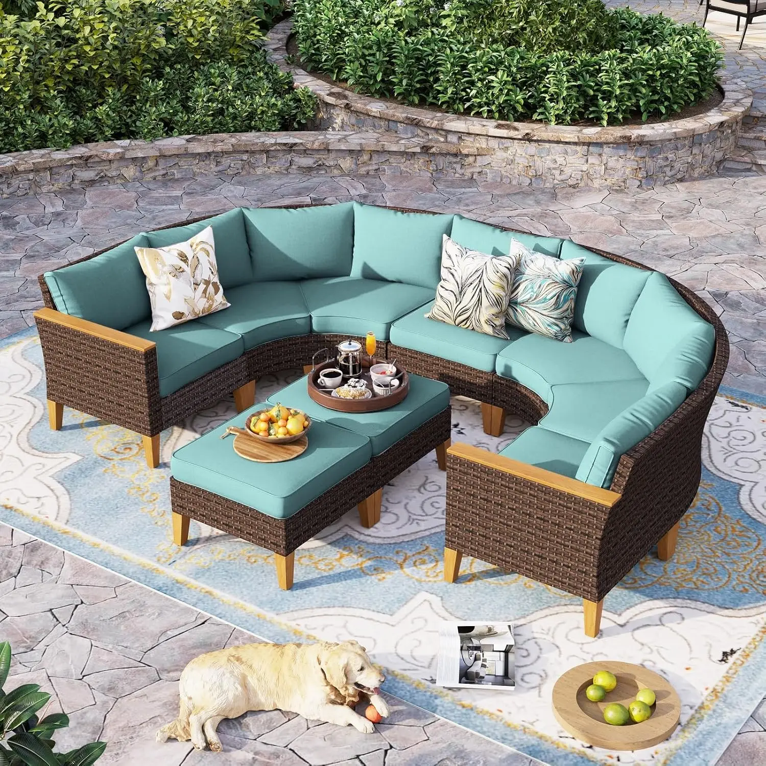 Half Moon Design: Our outdoor patio furniture set features a unique half moon design that adds a touch of elegance and sophistication to your outdoor space. The curved shape creates a cozy and intimate seating area that is perfect for entertaining guests or lounging with your loved ones. This halfmoon set fits in Gazebo. You can also use ottoman in a variety of ways. It can be used as a footrest, extra seating, or even as a coffee table