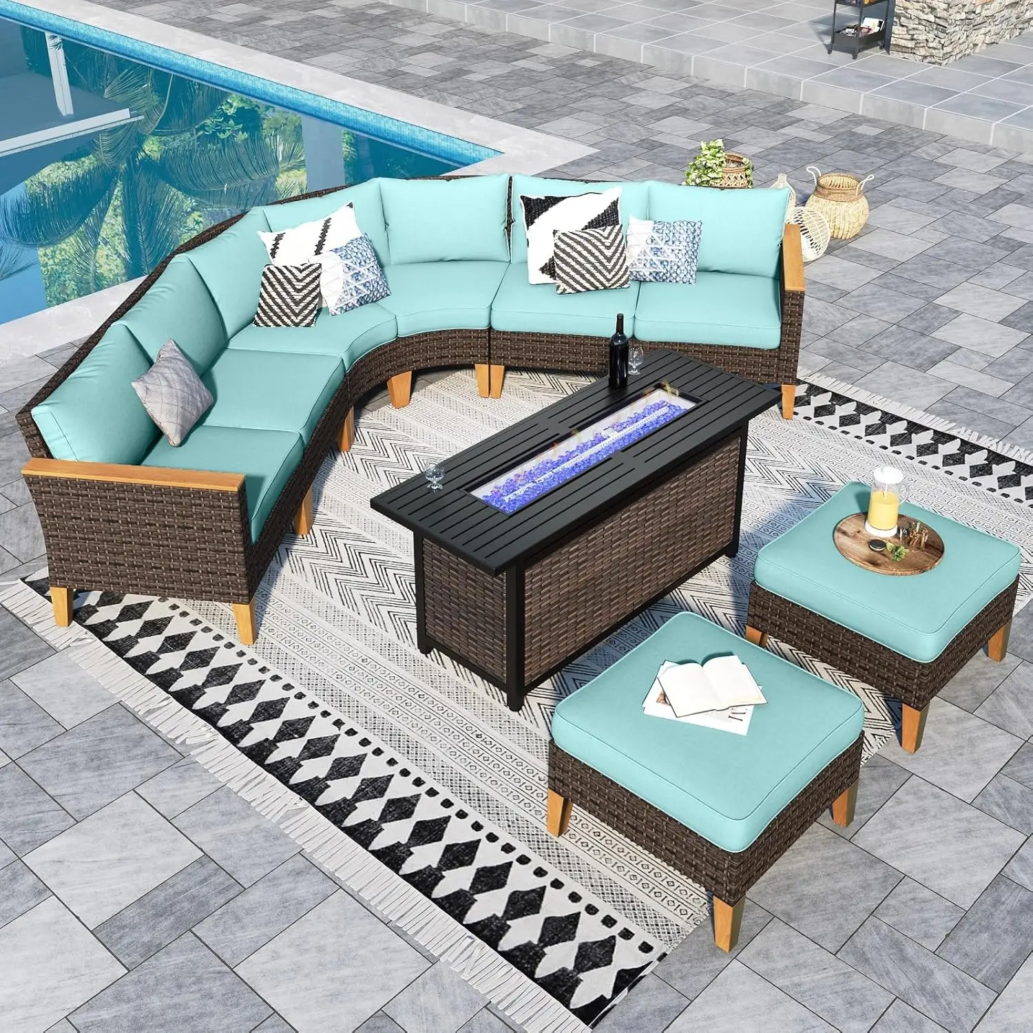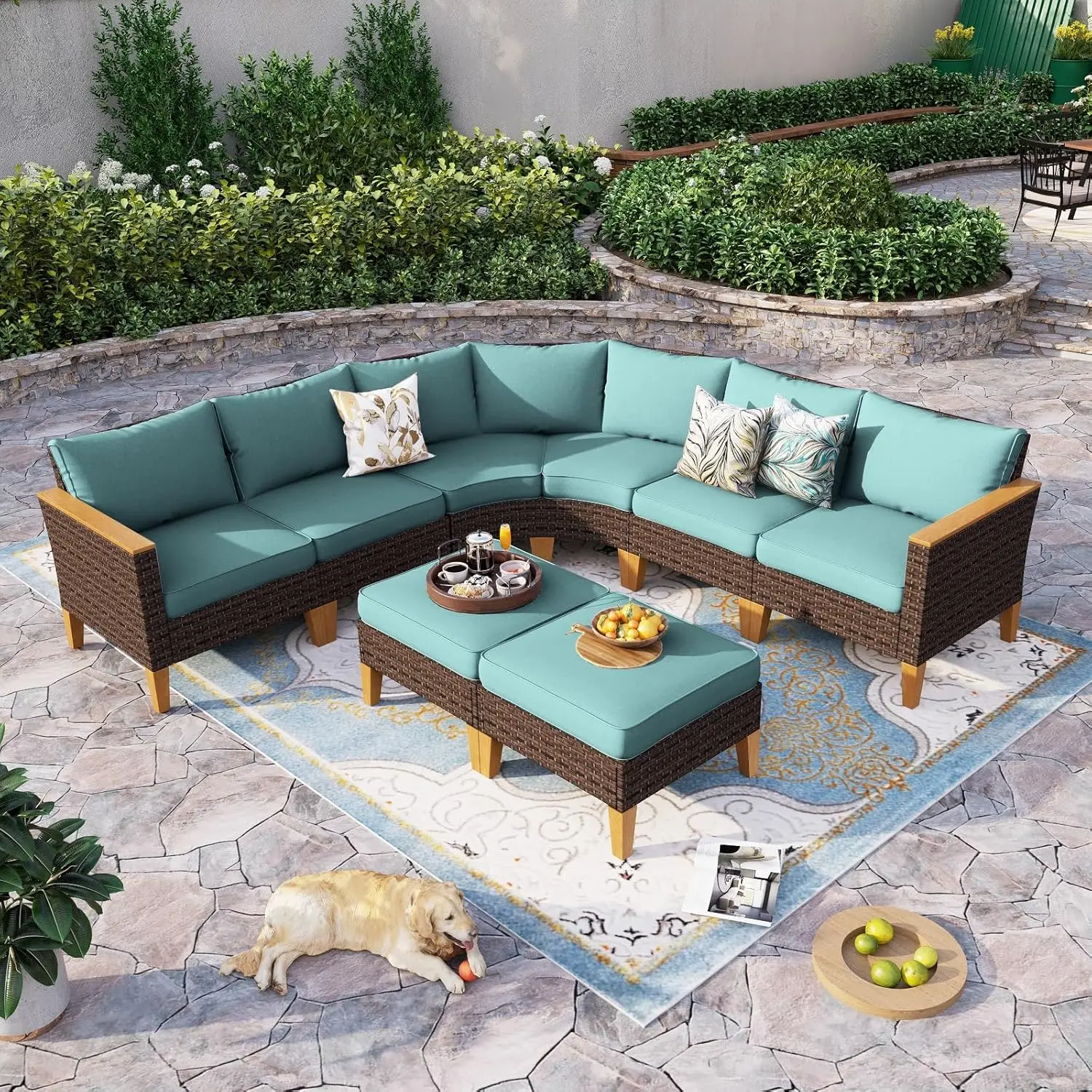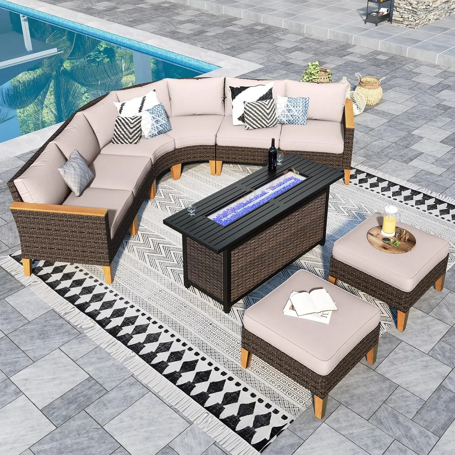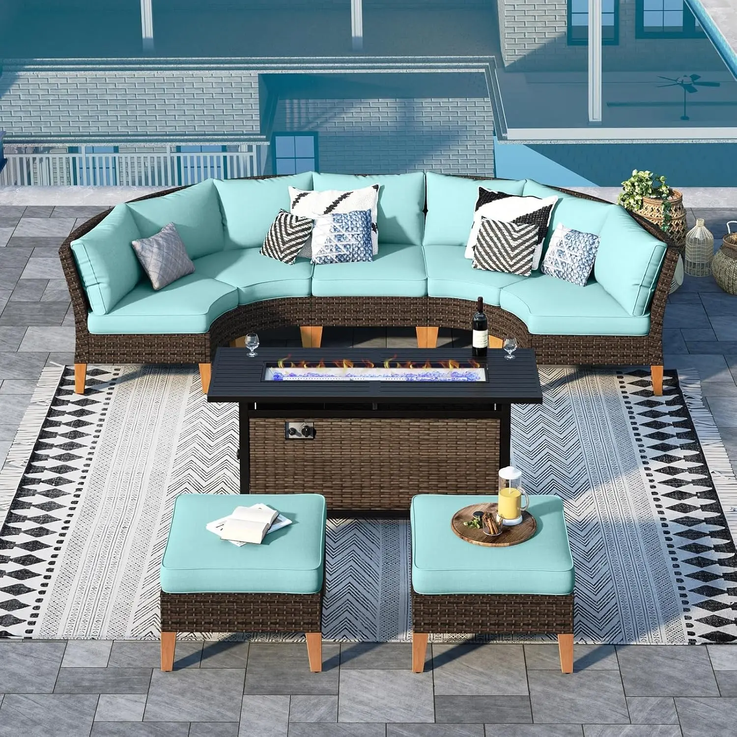 Half Moon Design: Our outdoor patio furniture set features a unique half moon design that adds a touch of elegance and sophistication to your outdoor space. The curved shape creates a cozy and intimate seating area that is perfect for entertaining guests or lounging with your loved ones. This halfmoon set fits in Gazebo. You can also use ottoman in a variety of ways. It can be used as a footrest, extra seating, or even as a coffee table