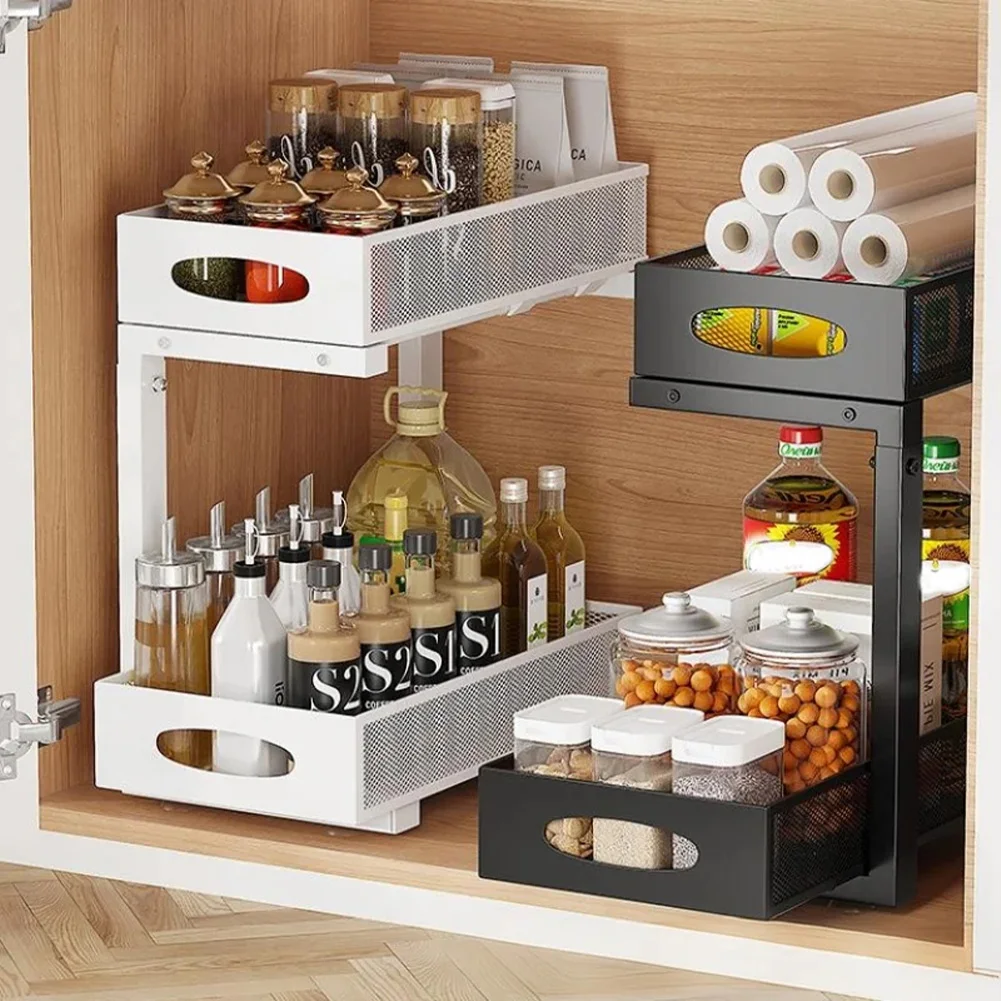 Durable Construction: This 2-tier pull-out cabinet organizer is crafted from high-quality metal materials, ensuring durability and long-lasting use.